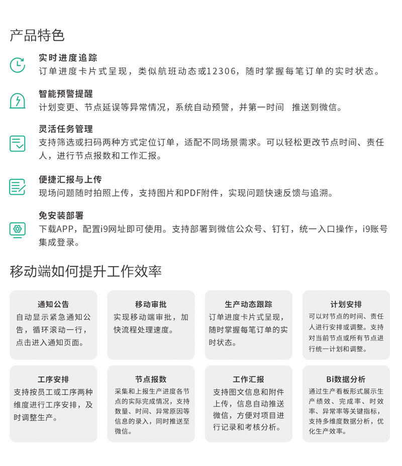移动端随时了解生产进度,节点任务推送到个人,以人为中心;根据不同的用户角色进行数据透视和过滤,实现人性化的操作体验。基本功能包含:消息预警、生产进度、计划安排、工序安排、节点报数、工作汇报(手机上图)、BI分析等。
